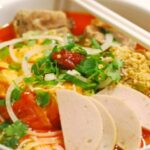 Beef broth (lemongrass flavor) with beef shank, Vietnamese pork roll serves on vermicelli noodle, celery, cabbage, cilantro, scallions, onion and bean sprout.
